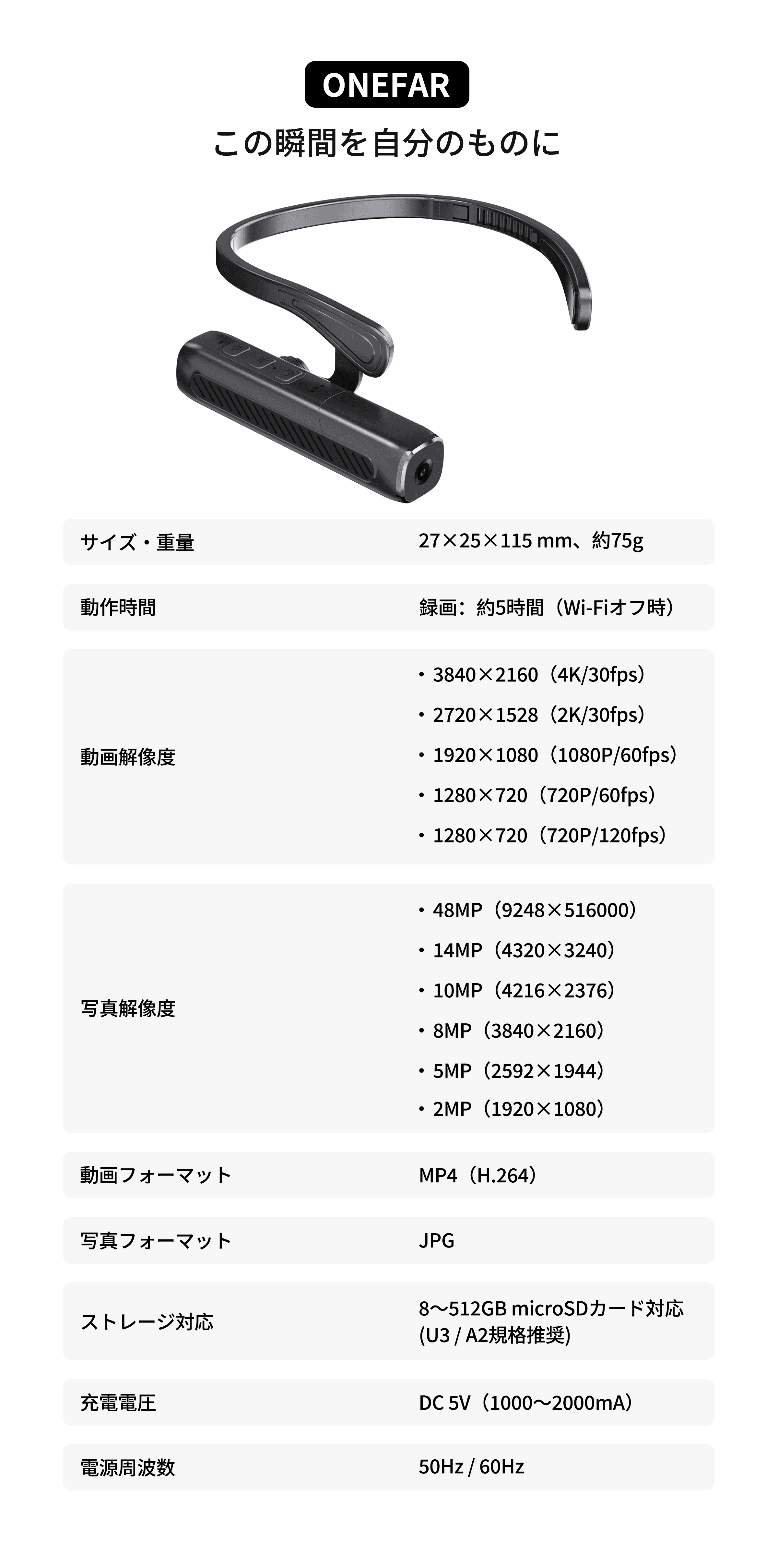 ONEFARは4K・2K・1080P・720Pの複数の解像度に対応しております。最大120fpsのハイフレームレート撮影では、ランニングやサイクリングのような素早い動きでも、滑らかで鮮明、